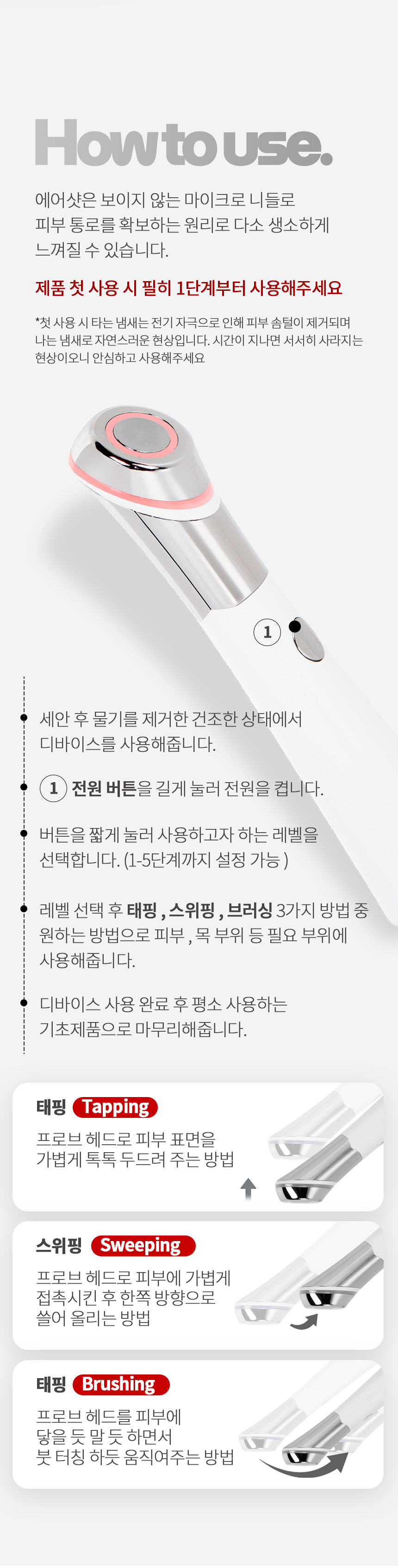 처음 사용할 때는 1단계부터 서서히 적용기간을 보호하면서 단계를 올려 사용하십시오.